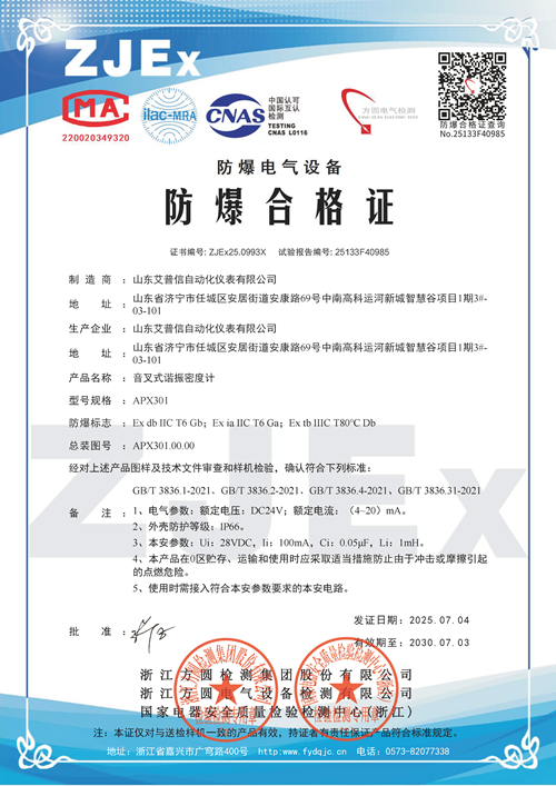 標(biāo)準(zhǔn)款音叉物位開關(guān),優(yōu)質(zhì)防爆鑄造鋁殼,不銹鋼銘牌,sus316叉體材質(zhì)。 型號(hào):APXYC504 應(yīng)用:液體/粉體 供電:24VDC/220AC 輸出:繼電器(DPDT) 連接過程:G1''螺紋 叉體長(zhǎng)度:100mm 介質(zhì)溫度:-30℃-80℃ 壓力:≤4MPa 防爆等級(jí):Exd IIC T6 Gb 防護(hù)等級(jí):IP65
